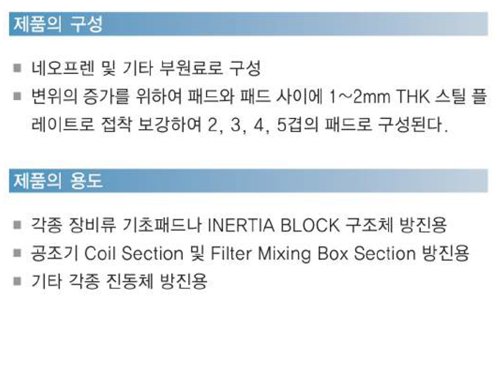 네오프렌 합성고무로서 내유성, 내산성, 내후성, 내열성에 충분한 특성을 가진 것으로 상부 및 하부 표면이 요철형식으로 에어포켓으로 이루어져 있는 제품입니다.
