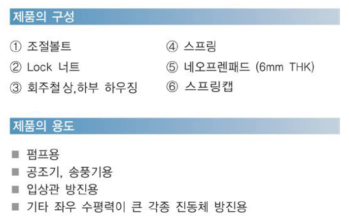 KS B 1563 밀폐형 방진 스프링 마운트는 진동문제를 일괄적으로 처리할 수 있게 고안되었다. 특히 장비의 운전시 발생하는 수평밀림힘을 하부 하우징 안에 부착된 스폰지에 의해 보호된다.
