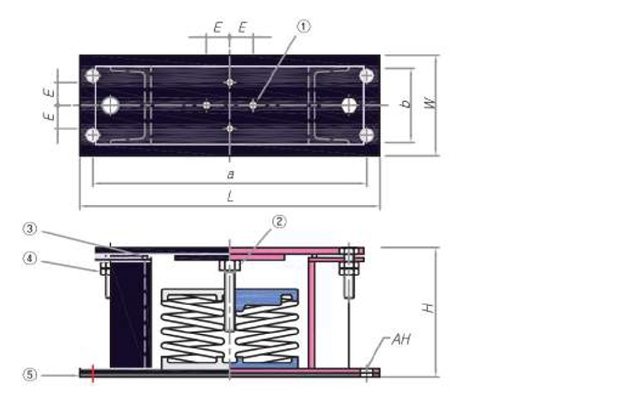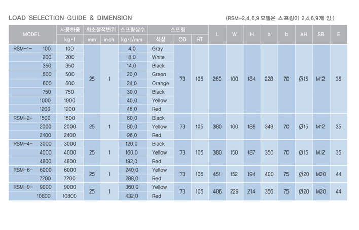 제한형 스프링 마운트 RSM 방진 스프링은 25mm의 정적변위를 가지며 중량물이면서 장비의 설치 시 중량과 운전 시의 중량이 상이하게 다른 장비를 위해 특수 제작되어진 제품입니다.