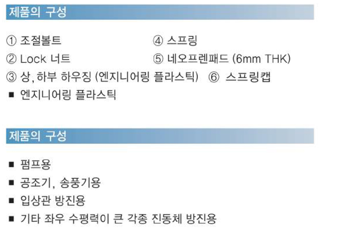 엔지니어링 플라스틱 하우징 스프링 마운트는 내열성, 내마모성, 내약품성, 전기특성등이 뛰어나며, 강하고 인장력이 좋습니다. 따라서, 외부에 노출되는 장비나 화학약품 취급이 많은 장소에 많이 설치되고 있으며, 하우징의 중량을 현저히 줄여 이동 및 설치가 용이한 제품입니다.